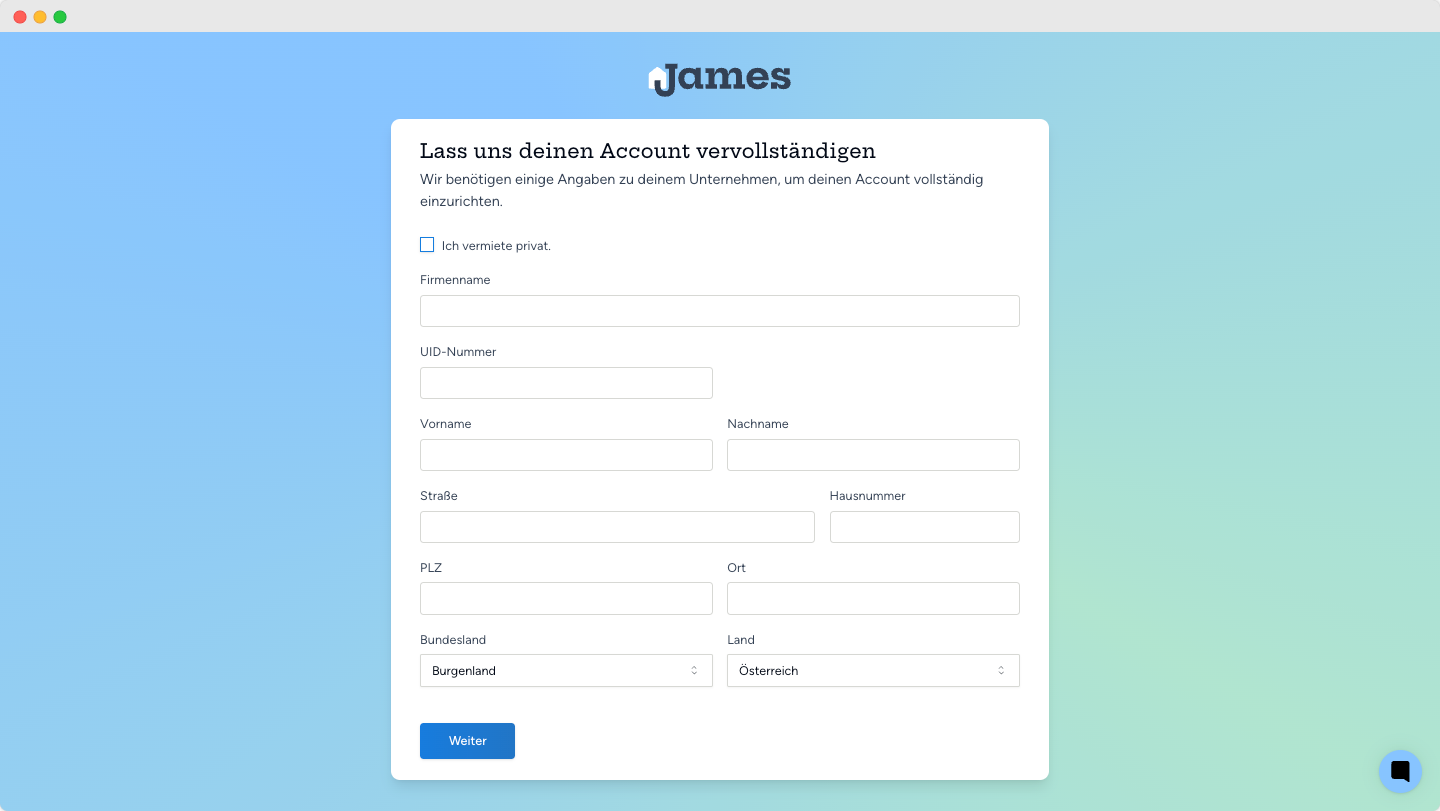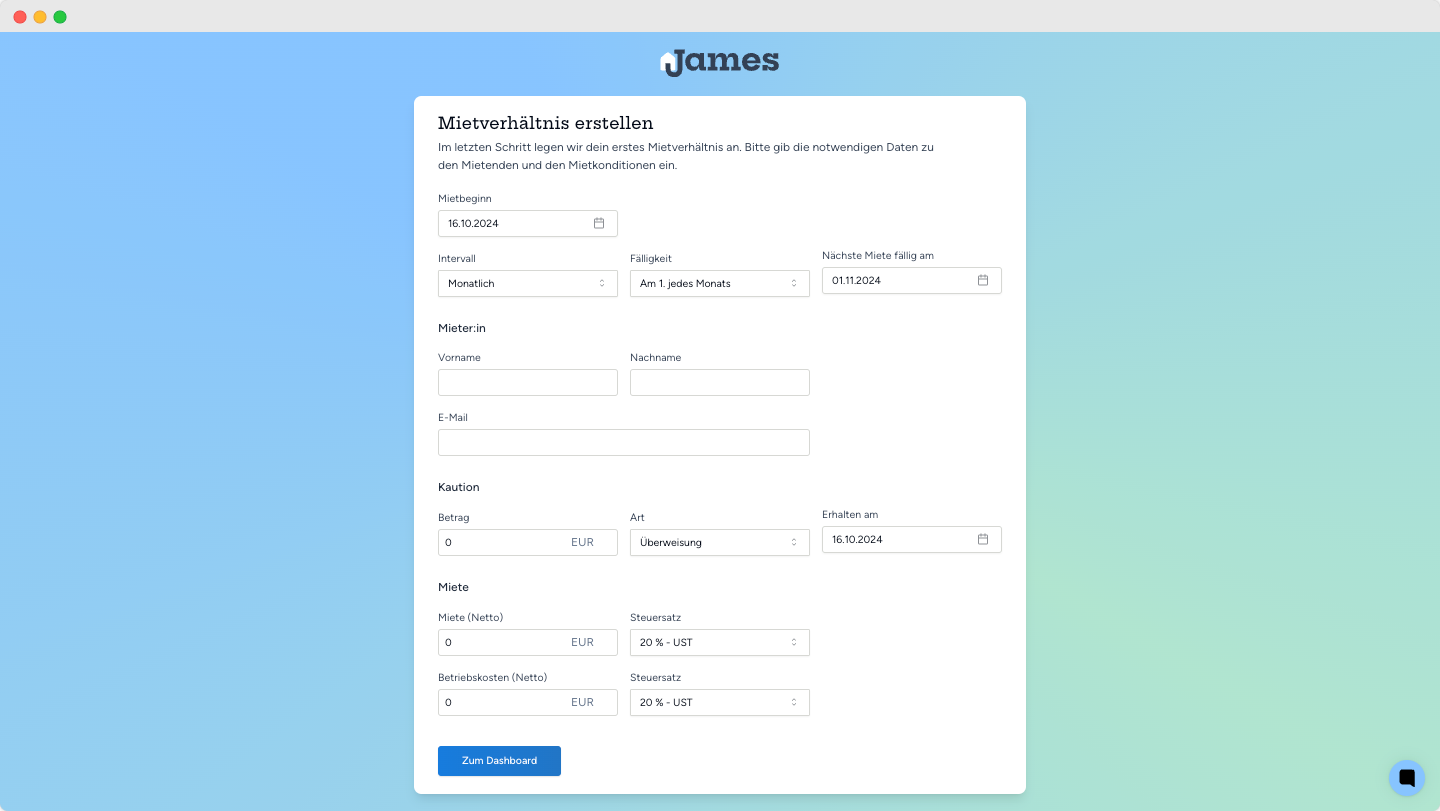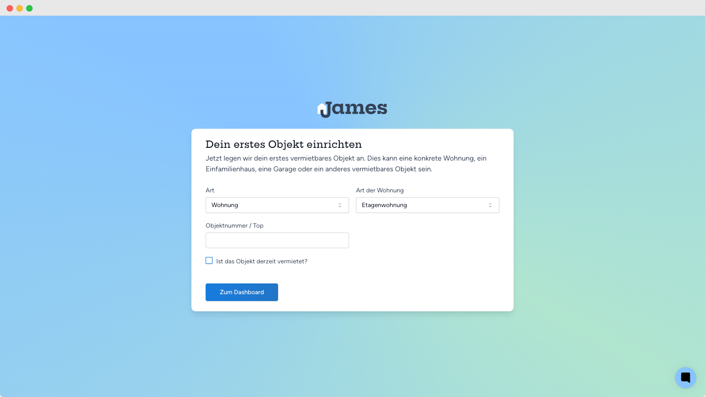 Wenn das Objekt derzeit nicht vermietet ist, ist das Onboarding vorerst abgeschlossen, und du kannst dich auf deinem Dashboard umsehen und die anderen Bereiche von James erkunden.