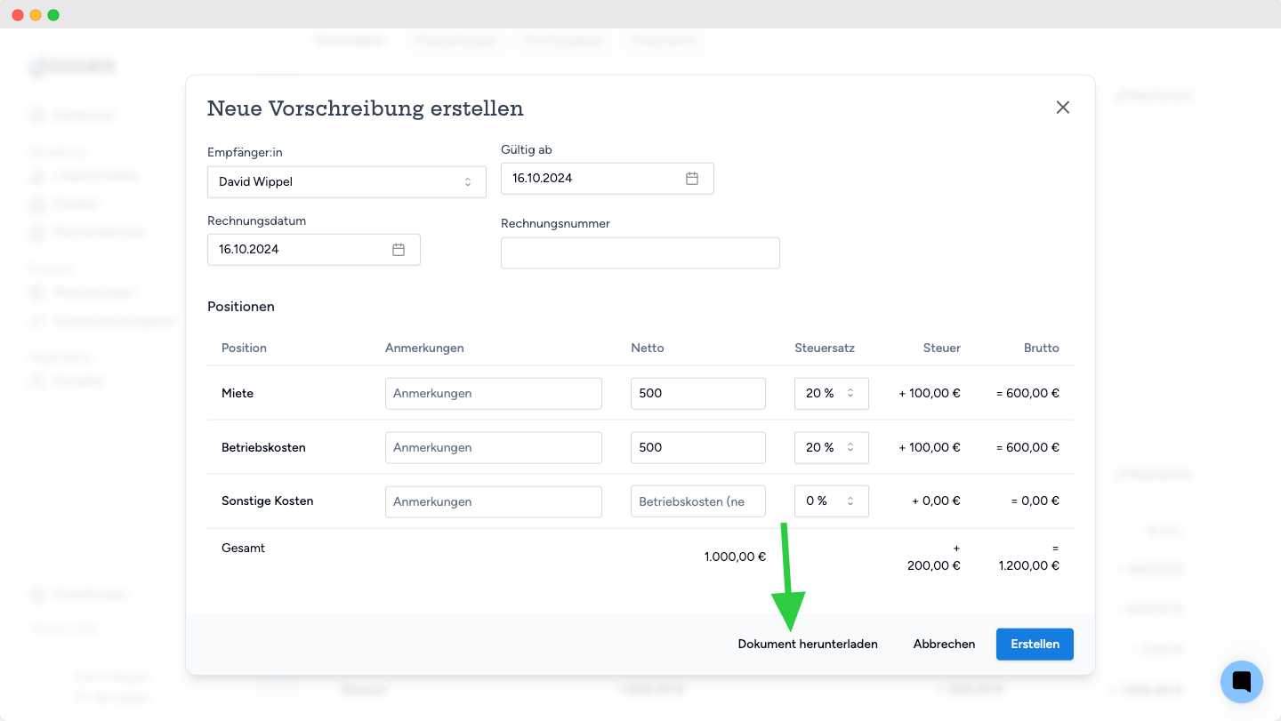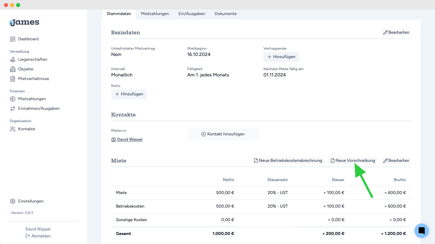 Stell sicher, dass du eine:n Mieter:in hinterlegt und Miete, Betriebskosten und sonstige Kosten eingegeben hast. Dann geht es weiter mit einem Klick auf "Neue Vorschreibung"
