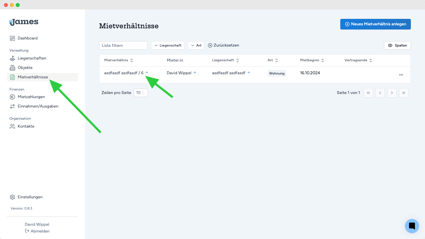 Wähle unter "Mietverhältnisse" das gewünschte Mietverhältnis aus und öffne es mit einem Klick auf die Adresse.